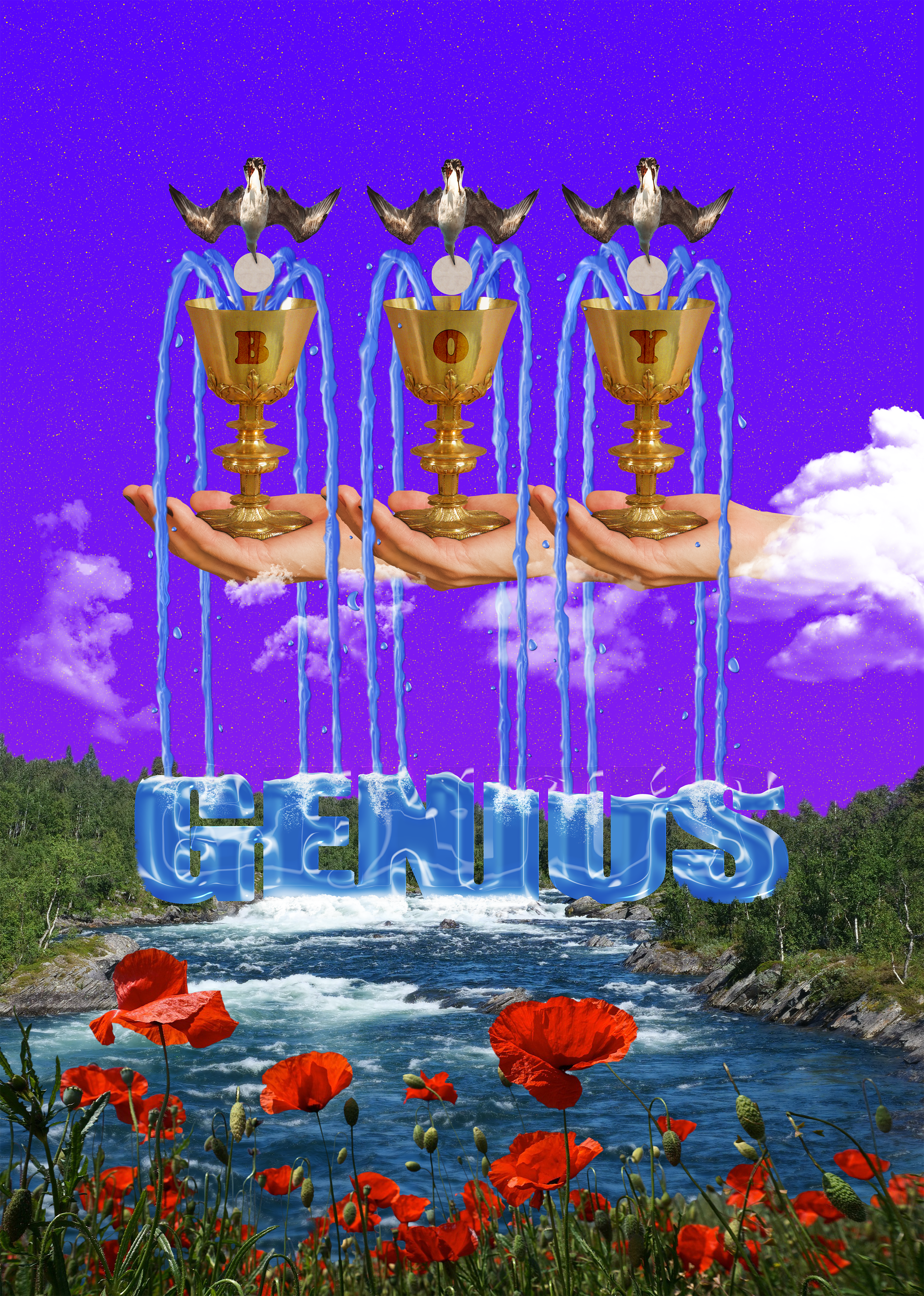 Kolaż jest ,,urzeczywistnieniem" ilustracji na koszulce zespołu boygenius. Zaintrygowała mnie wielowymiarowość grafiki oraz to, że zdaje się ona rozgrywać w naturze. Zaczęło się stosunkowo prosto od zrobienia dłoni z kielichami i ptaków z hostiami. Rzadko używam tekstu w trakcie tworzenia świata, ale tutaj pozostałam wierna oryginałowi. Stworzyłam napis jako jedno połączone naczynie. Potem przeszłam do pracy z wodą i o jeju. Zabrnęłam w wiele ślepych uliczek, żeby ją okiełznać. Oglądałam filmiki analizując fizykę płynów, a nawet robiłam własne eksperymenty w domu. Wielokrotnie musiałam modyfikować swoją początkową wizję. Przykładowo chciałam zrobić lejek w napisie, który byłby jednak rozpraszający i sprawiał, że napis wyglądał dziwnie. Pracowałam nad tym tworem miesiąc i był to najbardziej wielowymiarowy projekt, jaki robiłam do tej pory.