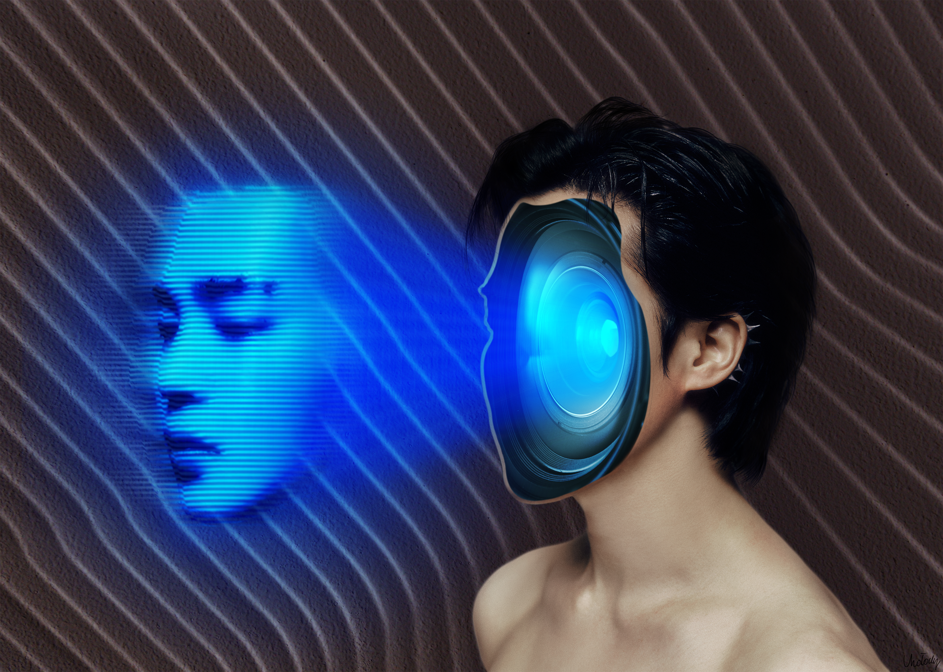 Animacja powstała na bazie mojego kolażu wykonanego na konkurs #My_favorite_FACE_of_Jimin na portalu Weverse. W pracy ukazałam twarz Jimina z BTS jako oddzieloną od głowy, co miało symbolizować istnienie wizerunku społecznego niekoniecznie tożsamego ze światem wewnętrznym jednostki. Było to wyjście z mojej strefy komfortu ze względu na przedstawienie zjawiska technologicznego. Zazwyczaj w kolażach poruszam się w krajobrazach i elementach naturalnych. Hologram dobrze oddaje istotę maski, którą czasem zakładamy w kontaktach międzyludzkich. W animacji postanowiłam użyć projekcji jako punktu wyjścia i zanimować jej powstawanie.