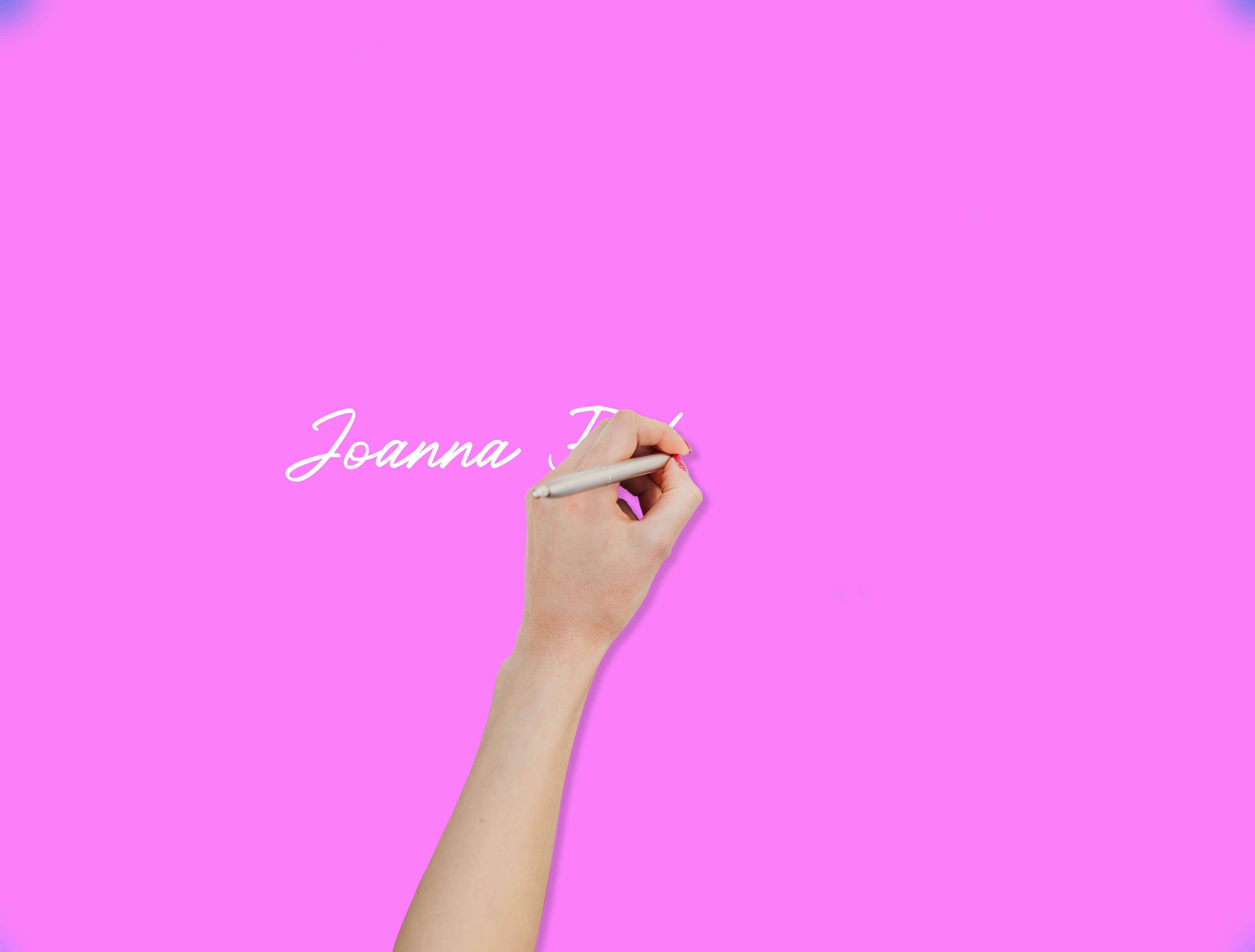 Animacja była propozycją wstępu dla vloga Joanny Bolesławskiej, których jestem montażystką. Chciałam zobrazować jej podpisywanie się z uwzględnieniem jej leworęczności i wybranego fontu symulującego pismo. Posłużyłam się pierwszy raz metodą animacji poklatkowej, robiąc poszczególne obrazu za pomocą programu Adobe Photoshop. Popełniłam przez to bardzo dużo błędów: od zrobienia zbyt dużej ilości klatek przez nieodpowiedni eksport obrazów po użycie złych technik w pracy. Z pewnością mogę powiedzieć, że dużo się nauczyłam i na pewno już wiem, jak policzyć odpowiednią ilość klatek. Kształty w rogach powstały za pomocą animacji płynnej w Adobe After Effects.
