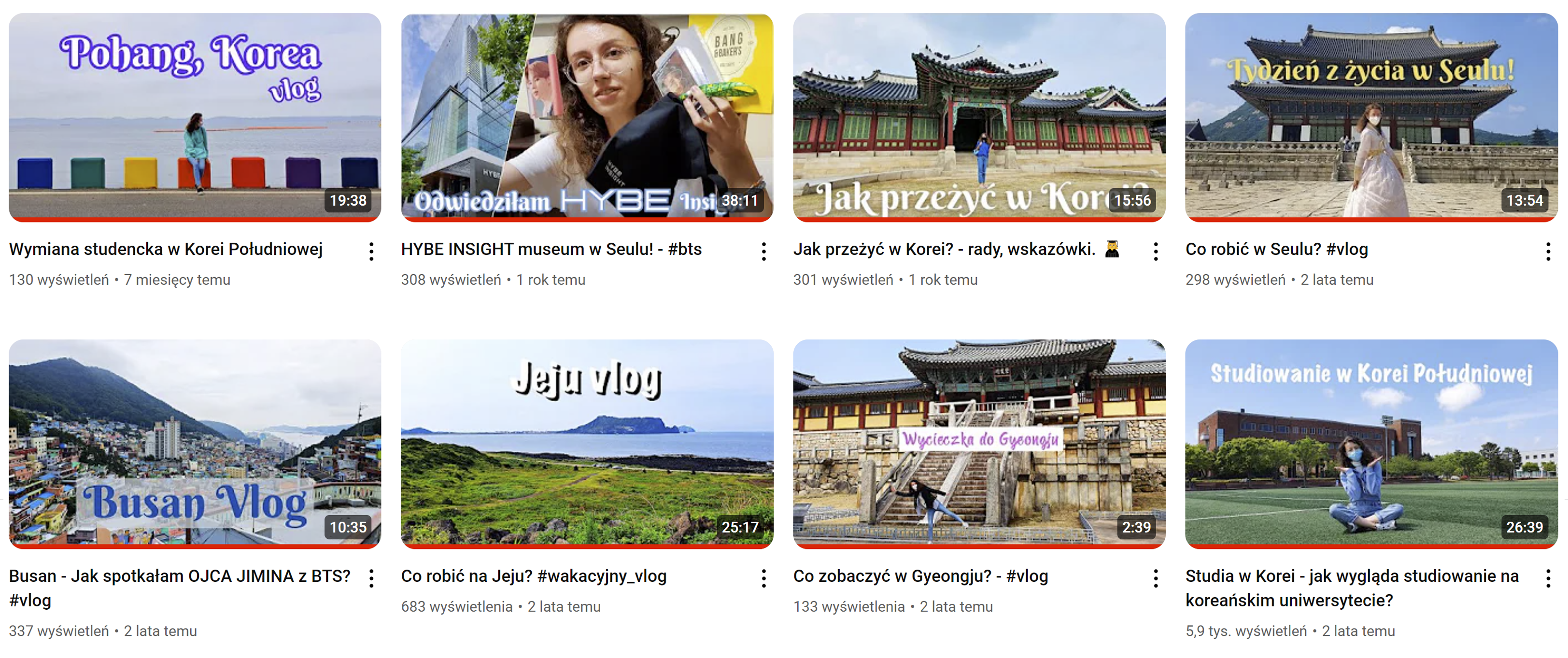 Jestem montażystką vlogów podróżniczych Joanny Bolesławskiej publikowanych na platformie Youtube. Filmy do tej pory dotyczyły tematyki Korei Południowej. Początkowo przyjmowały one formę klipów montowanych w rytm muzyki. Późniejsze vlogi opierają się już w większej mierze na narracji. Staram się, aby każdy twór miał spójny motyw kolorystyczny kojarzący się mnie czy Asi z danym miejscem, w którym była.